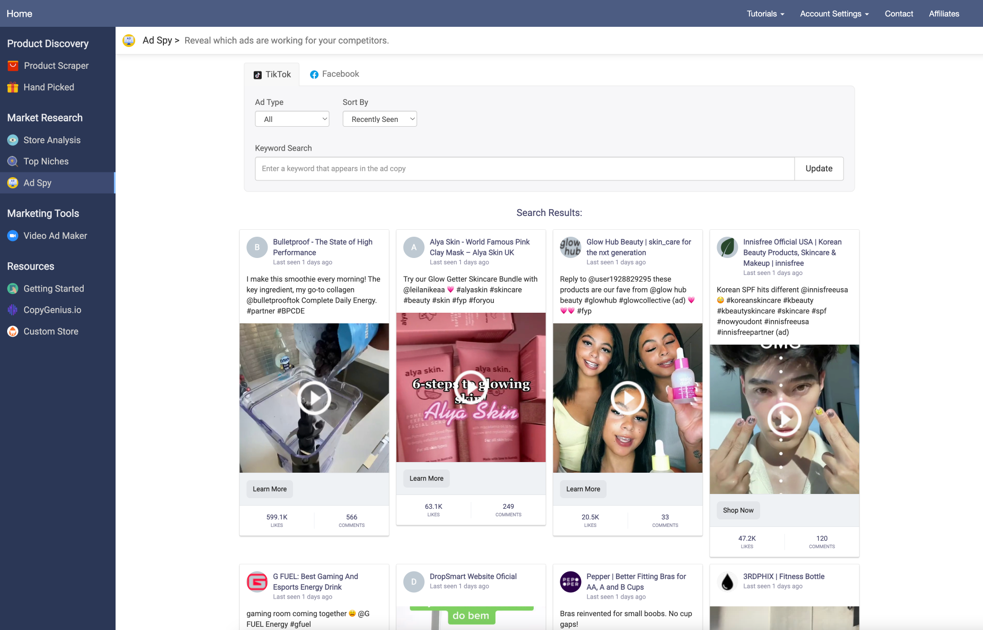 Browse the hottest TikTok and Facebook ads to find winning products and ads to model your own after. With AdSpy, you can quickly and easily find the best performing ads and products, so you can create your own winning campaigns!